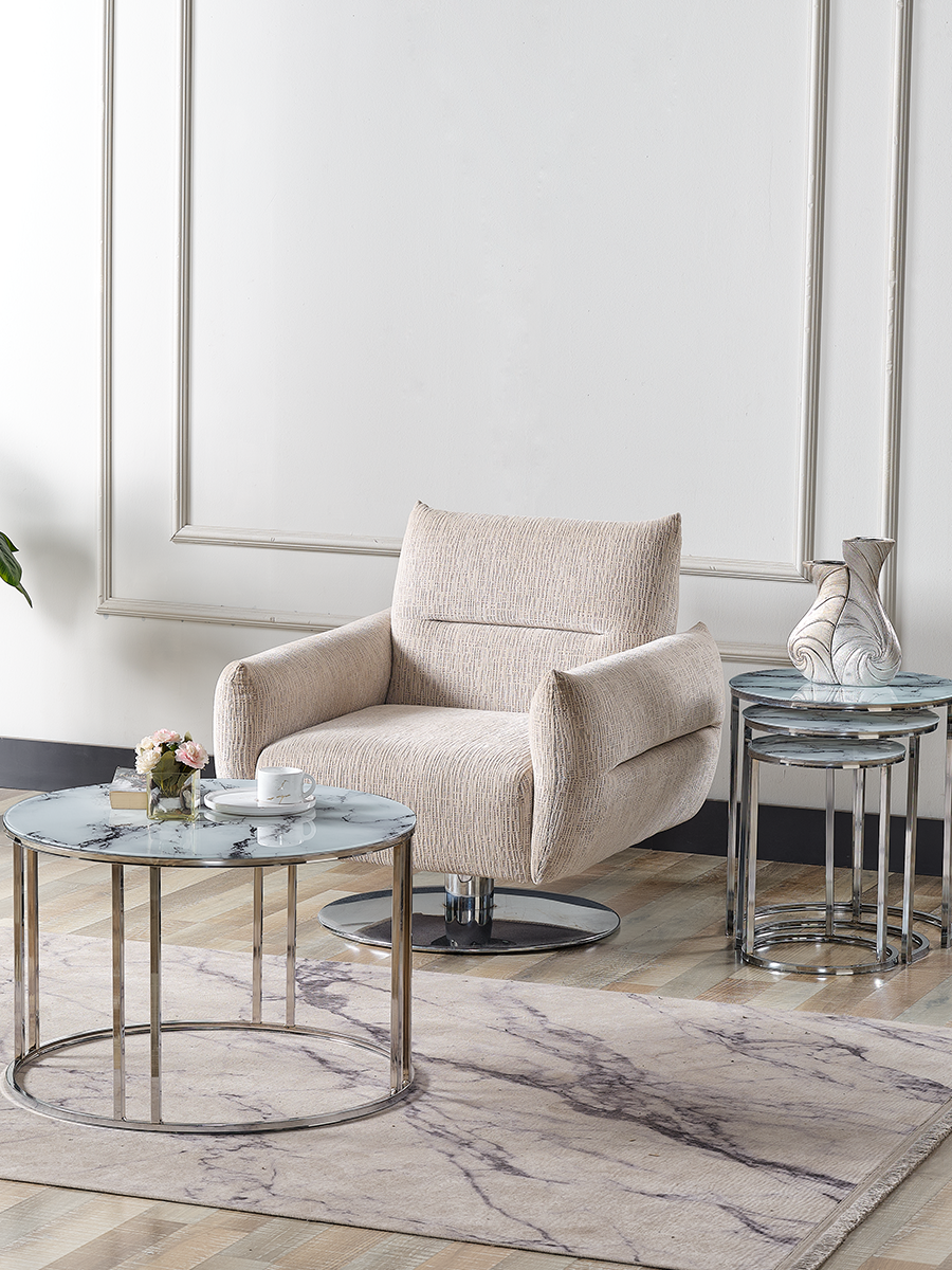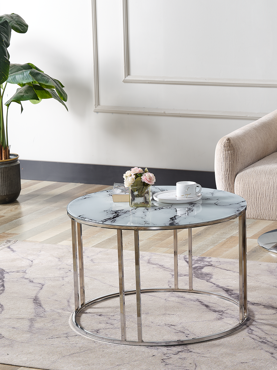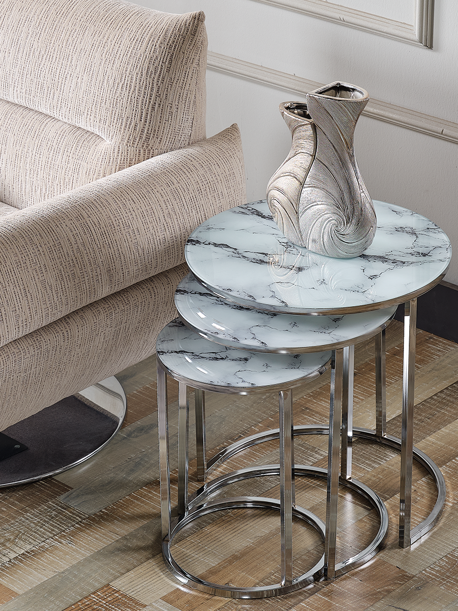 3 'Lü Zigon Ve Orta Beyaz Mermer Cam Nikel Ayak Sehpa Takımı