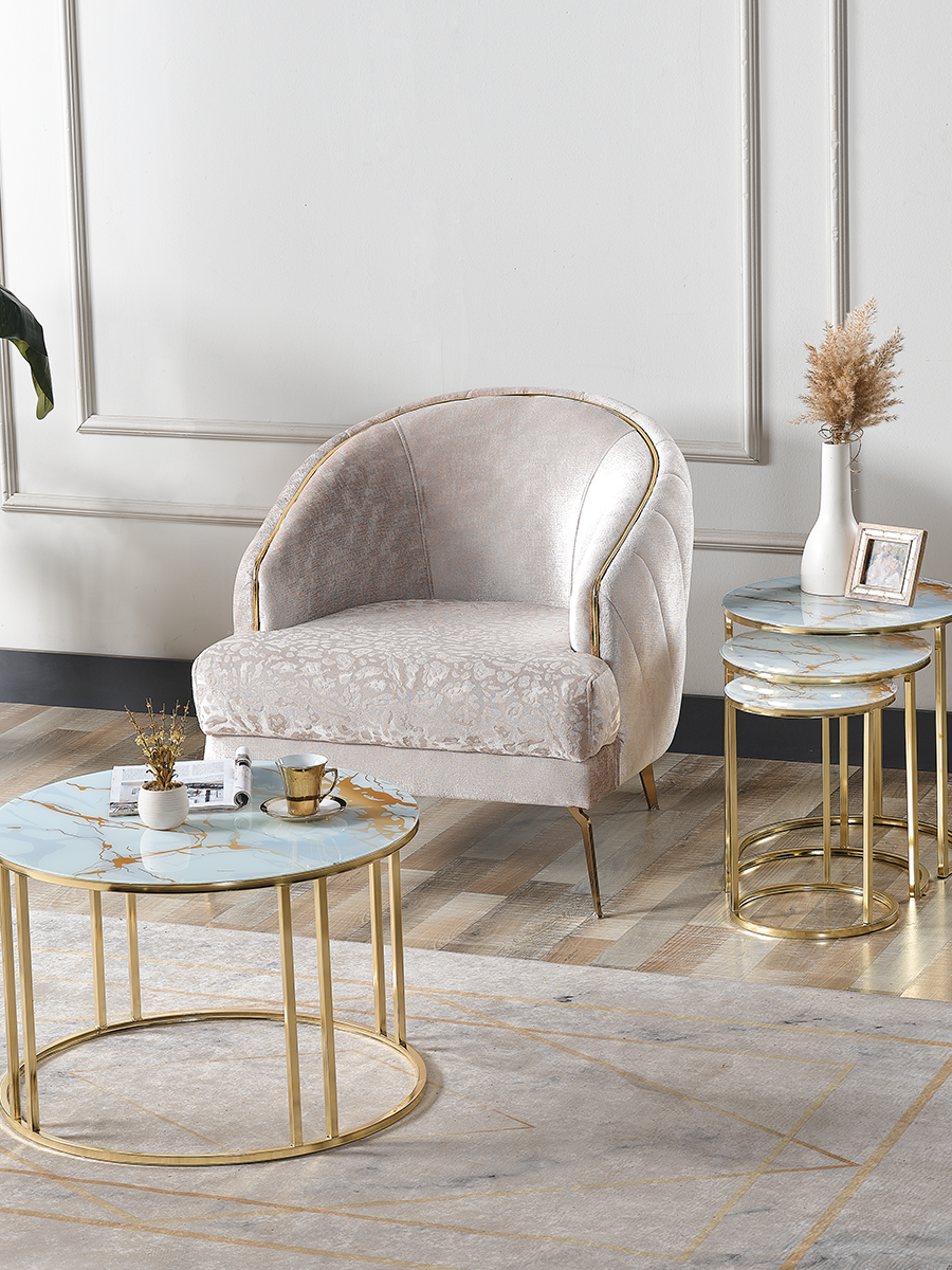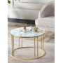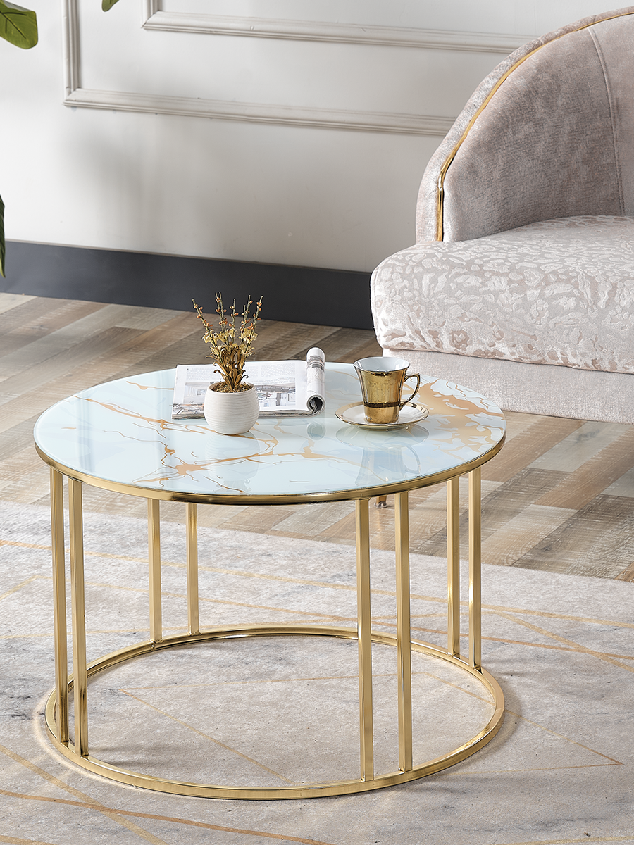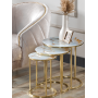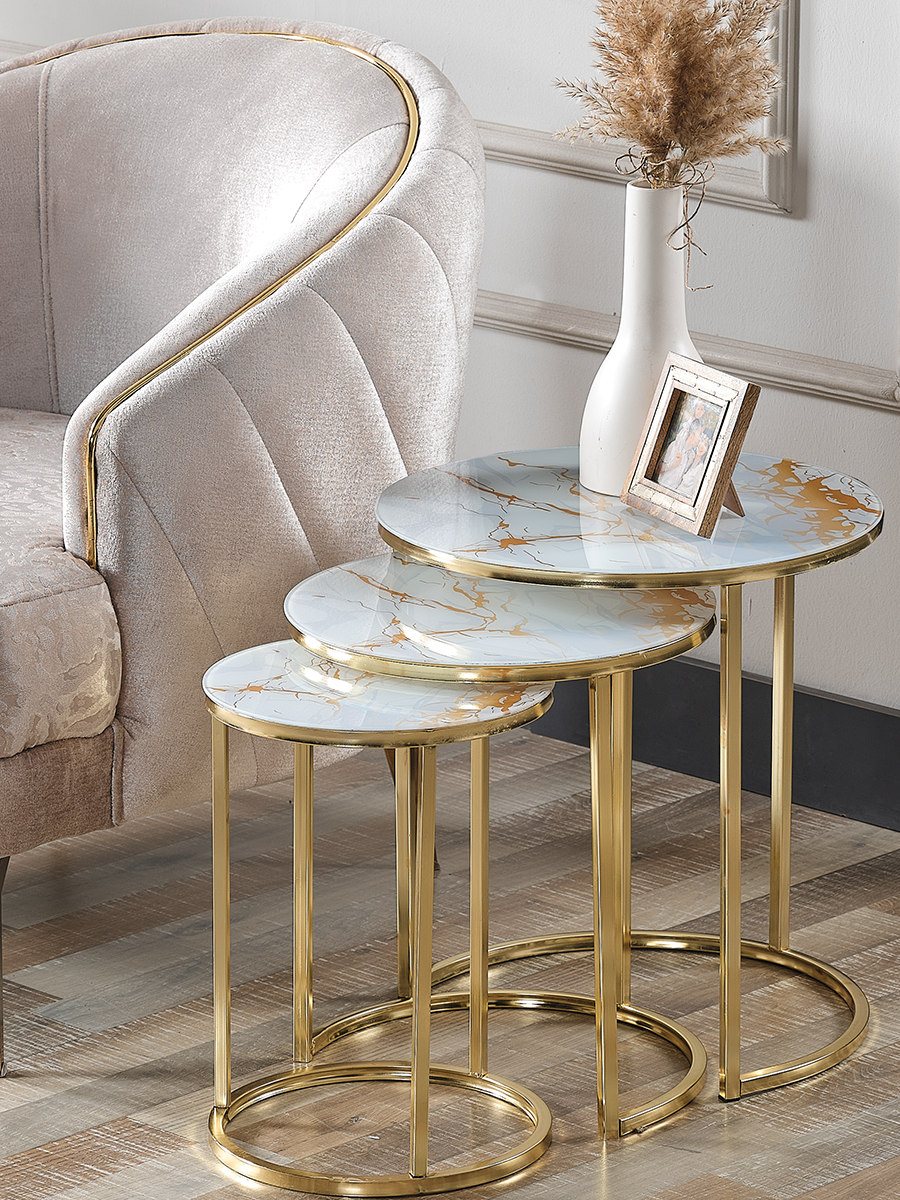 3 'Lü Zigon Ve Orta Beyaz Sarı Mermer Cam Gold Ayak Sehpa Takımı
