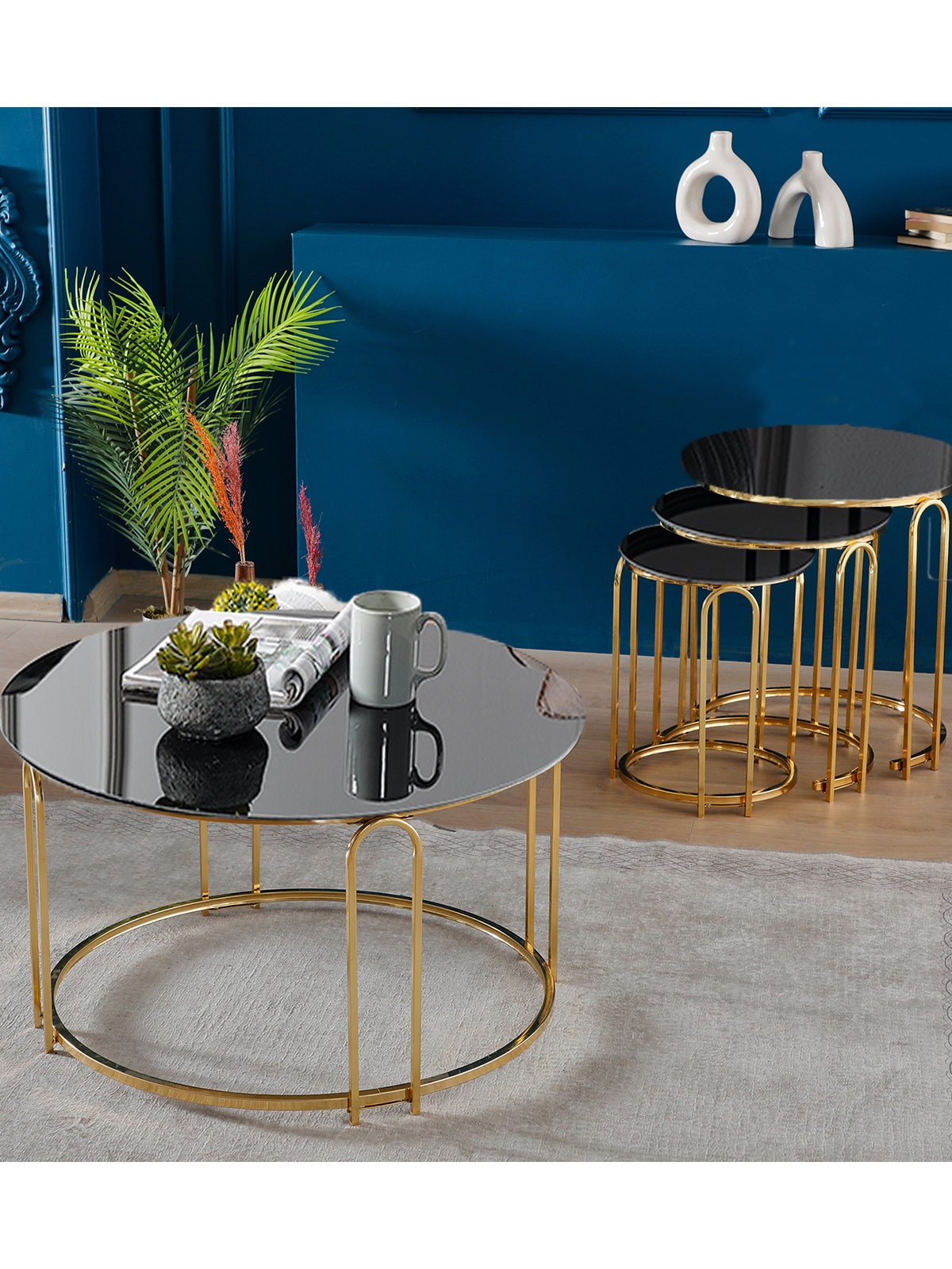 4 lü Lenka Zigon Orta Sehpa Takımı Yuvarlak Gold Metal 3+1 - Siyah Aynalı Temperli Cam zigon-orta LTKM-002, one size