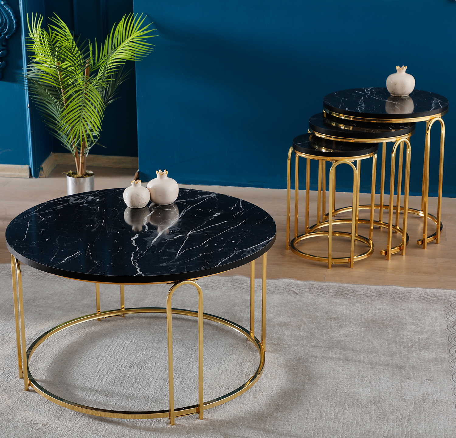 Lenka Siyah Mermer Ahşap Zigon Orta Sehpa Takımı Yuvarlak Siyah Metal 3+1 - lenka-zigonorta-siyah LTKM-003, one size