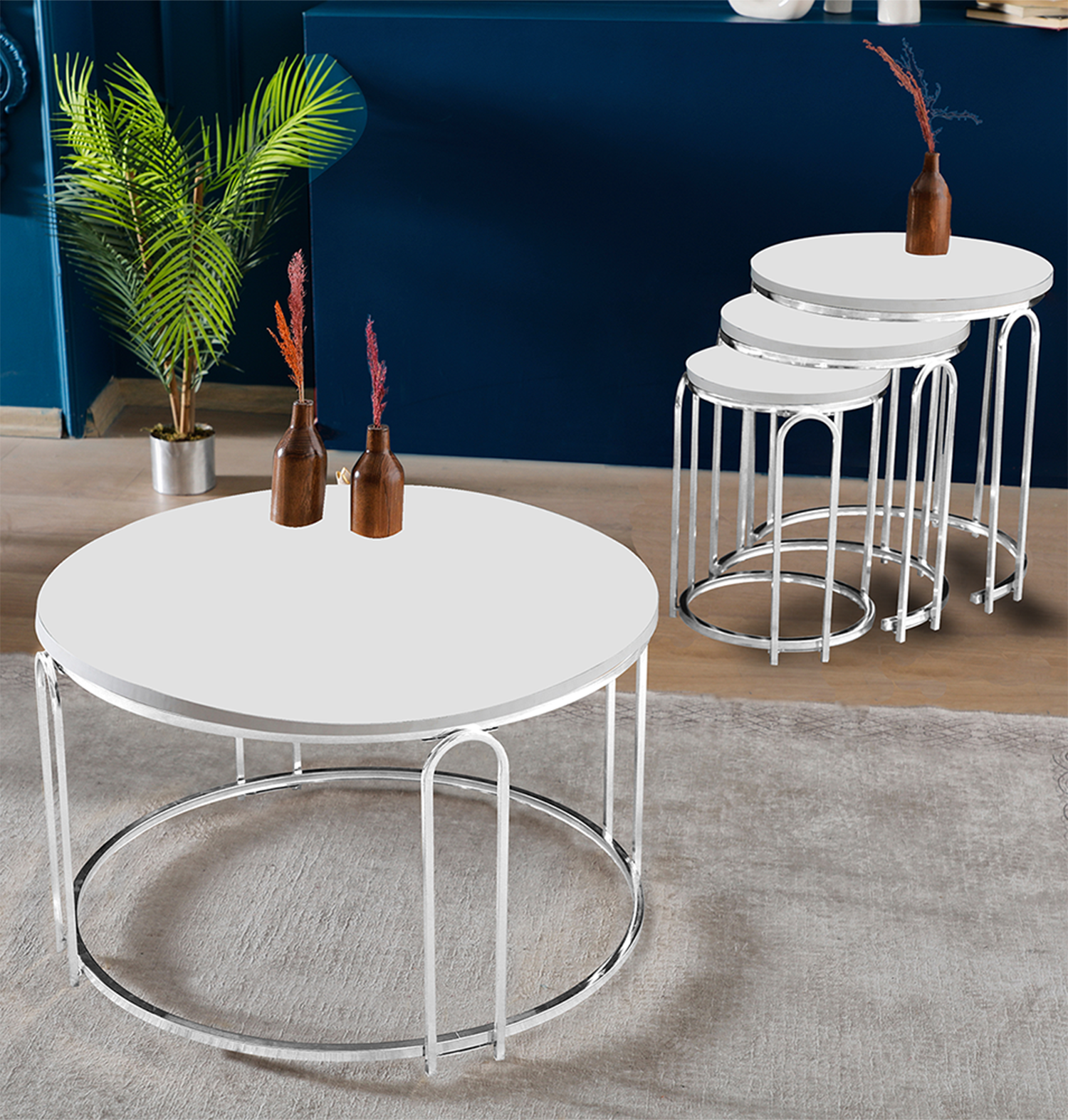 Lenka Zigon Orta Sehpa Takımı Yuvarlak Gümüş Metal 3+1 - Beyaz Ahşap zigonorta-gümüş LTKM-001, one size