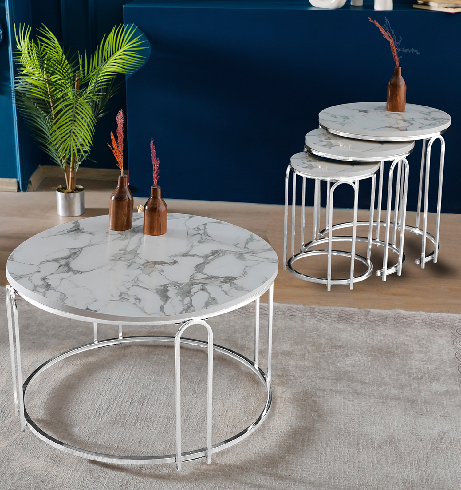 Lenka Zigon Orta Sehpa Takımı Yuvarlak Gümüş Metal 3+1 - Beyaz Mermer Ahşap zigonorta-gümüş LTKM-001, one size