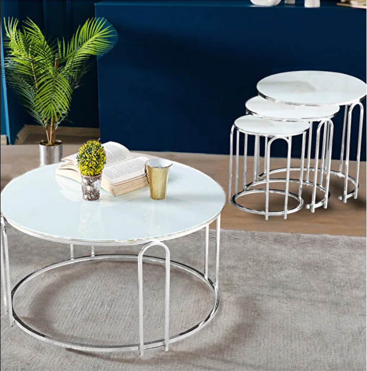 Lenka Zigon Orta Sehpa Takımı Yuvarlak Gümüş Metal 3+1 -Beyaz Temperli (kırılmaz) Cam gümüşayak LTKM-001, one size