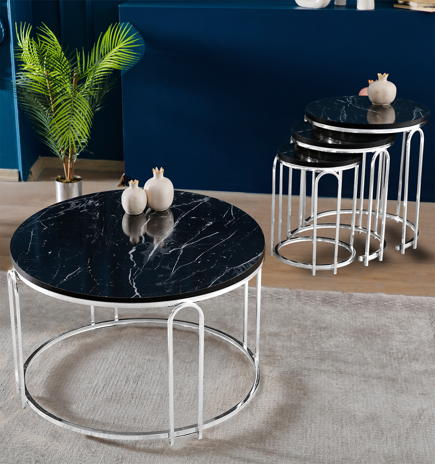 Lenka Zigon Orta Sehpa Takımı Yuvarlak Gümüş Metal 3+1 -Siyah Mermer Desenli Zigonorta-Gümüş